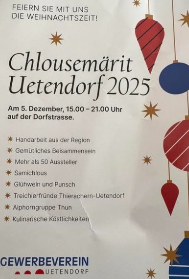Am 05.12.2025 findet der Chlousemärit in Uetendorf statt. Die Alphorngruppe Thun wird ein paar Melodien vortragen und anschliessend sicher einen Glühwein geniessen.